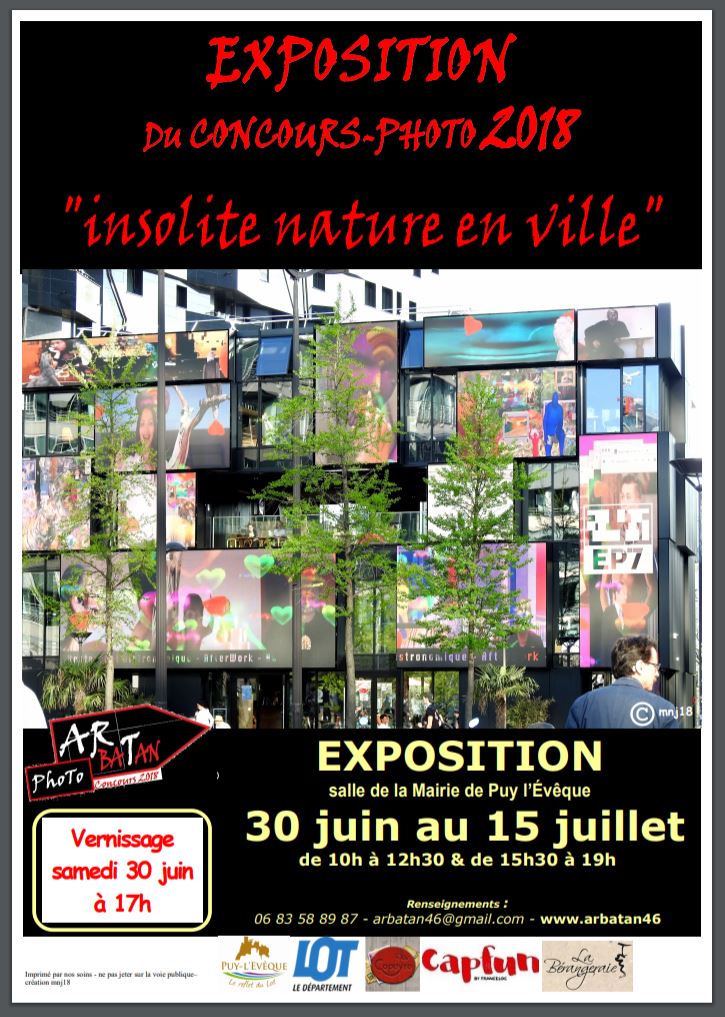 Jusqu’au 15 Juillet, exposition des participant(e)s au 7 ème Concours photo de l’association Arbatan. Plus d’une centaine de photos de 36 participant(e)s de toutes les régions françaises sont exposées à la Salle de la Terrasse de la Mairie de Puy-L’Évêque… Le thème choisi cette année: « Insolite nature en ville ». Venez voir ce que cela a inspiré chez les photographes et votez pour faire gagner à l’un ou l’une le Prix du Public… En outre, un jury composé de photographes professionnels et amateurs d’art décernera des prix et le palmarès sera proclamé le 15 Juillet à 11h30.