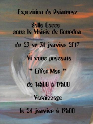 Exposition: Effet de Mer à Gourdon Publié le samedi, 4 février 2017lundi, 6 février 2017 par Pascalho . . . Du 23 au 31 janvier L’artiste: Virginie Joanez nous transporte dans ses voyages qu’elle a vécu à la fois comme des réalités et des rêves. La mer et les tours de New-York sont des reflets de son âme. Vernissage le 24 janvier