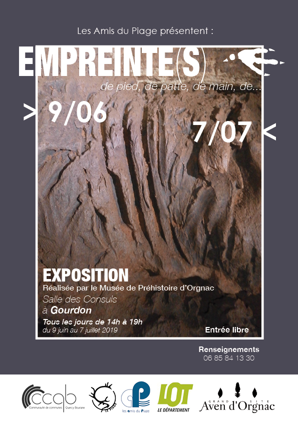 ENCORE QUELQUES JOURS EMPREINTES de pieds, de pattes, de mains, de … Comment ces empreintes se sont-elles conservées dans les grottes ? Comment sont-elles datées, interprétées ? Quelles histoires nous racontent-elles ? C’est ce à quoi Les Amis du Piage vous invitent à découvrir ! Cette formidable exposition de 25 panneaux, réalisée par le Musée de Préhistoire d’Orgnac (Ardèche), vous attend à Gourdon, salle des Consuls (sous la Mairie), jusqu’au dimanche 7 juillet, tous les jours de 14 h à 19 h (entrée libre).