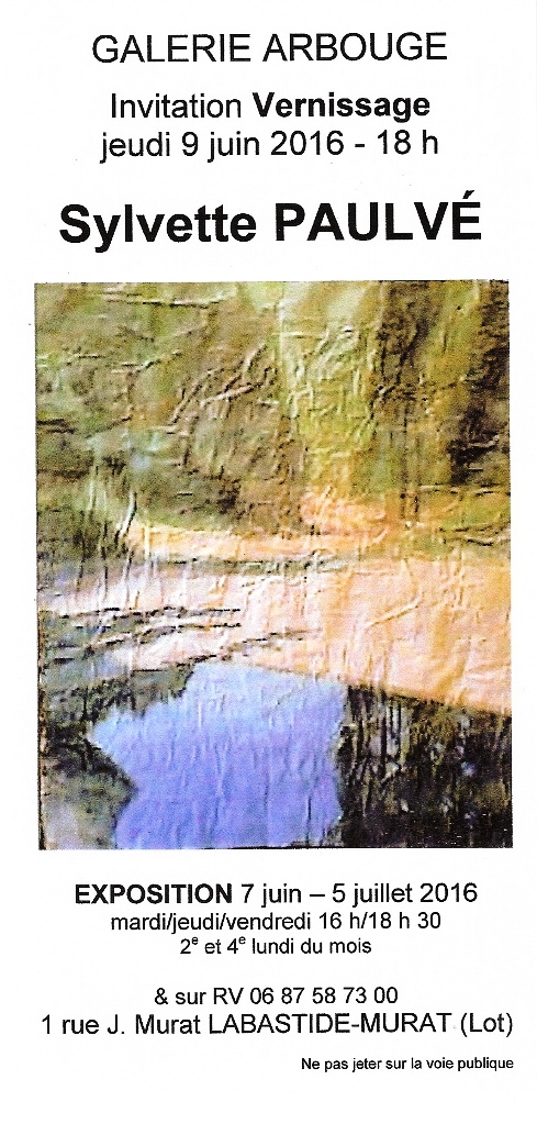 invitation Sylvette Paulvé.Du 7 juin au 5 juillet, les œuvres nouvelles de Sylvette Paulvé, œuvres réalisées sur papier froissé collé seront présentées à la Galerie Arbouge de Labastide-Murat.