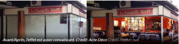 D’autres municipalités, (plus riches peut-être) habillent les commerces vides du centre-ville d’adhésifs en trompe-l’œil. D’immenses autocollants (des vitrophanies) présentant un décor attrayant de boutique Ca donne ceci :