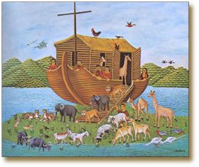 Dans le livre de la Genèse, Dieu ordonne à Noé de sauver sa famille du déluge ainsi que tous les animaux de la terre. Noé construit donc une arche et fait embarquer un couple de chaque espèce.