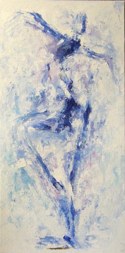 Dans la première partie ce sont des bleus aériens , des rouges flamboyants , des lignes rythmées , des noirs profonds et mystérieux. Ces couleurs accompagnent les corps qui évoluent librement dans des espaces ouverts. On est emporté à la fois par le mouvement des coups de pinceaux et des inflexions colorées.