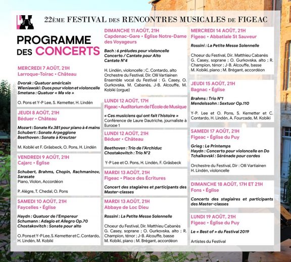 Olivier Pons : Ils y trouvent quelque chose de rare : l’impression d’avoir un costume sur mesure ! Je m’explique : le fait d’être artiste moi-même, et de fréquenter de nombreux festivals en tant qu’artiste invité me donne un atout considérable pour organiser des concerts et rencontres, qui donnent particulièrement bien la possibilité aux artistes de donner le meilleur d’eux-mêmes. Ils perçoivent dans les Rencontres Musicales de Figeac des concerts très exigeants, mais des conditions permettant l’excellence. D’autre part, il est certain que le Figeacois exerce un certain magnétisme, que ces paysages touchent l’âme, et que les musiciens, venus de l’étranger, y sont particulièrement sensibles. J’en prends pour preuve les milliers de photos de Béduer, Figeac, Cajarc, que l’on trouve sur Facebook après le festival…