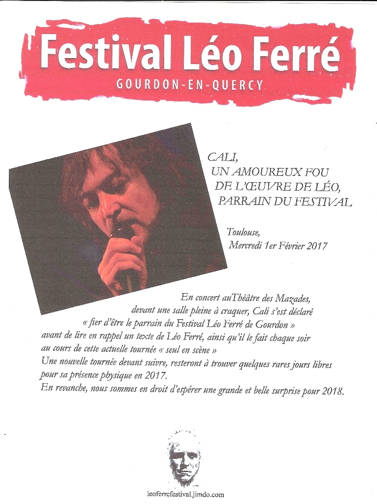 A chacun de ses concerts, Cali évoque Léo Ferré. En 2016, il a participé à plusieurs évènements liés au centenaire de la naissance de Léo Ferré qui, rappelons-le, a vécu plusieurs années près de Gourdon et a écrit des poèmes et des textes remarquables sur notre région.