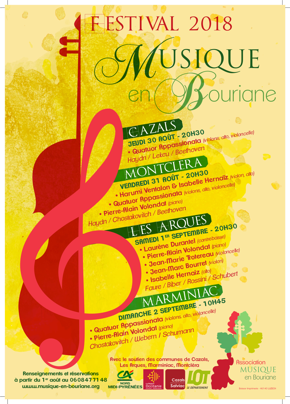 La 17ème édition du Festival MUSIQUE EN BOURIANE aura lieu du jeudi 30 août au dimanche 2 septembre 2018 dans les chapelle et églises de Cazals, Montcléra, Les Arques et Marminiac.