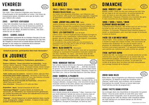 Comme à notre habitude, nous avons réuni des artistes de différents horizons : chansons françaises, musique du monde, classique, contes, arts de la rue, jeune public, arts plastiques, littérature…..