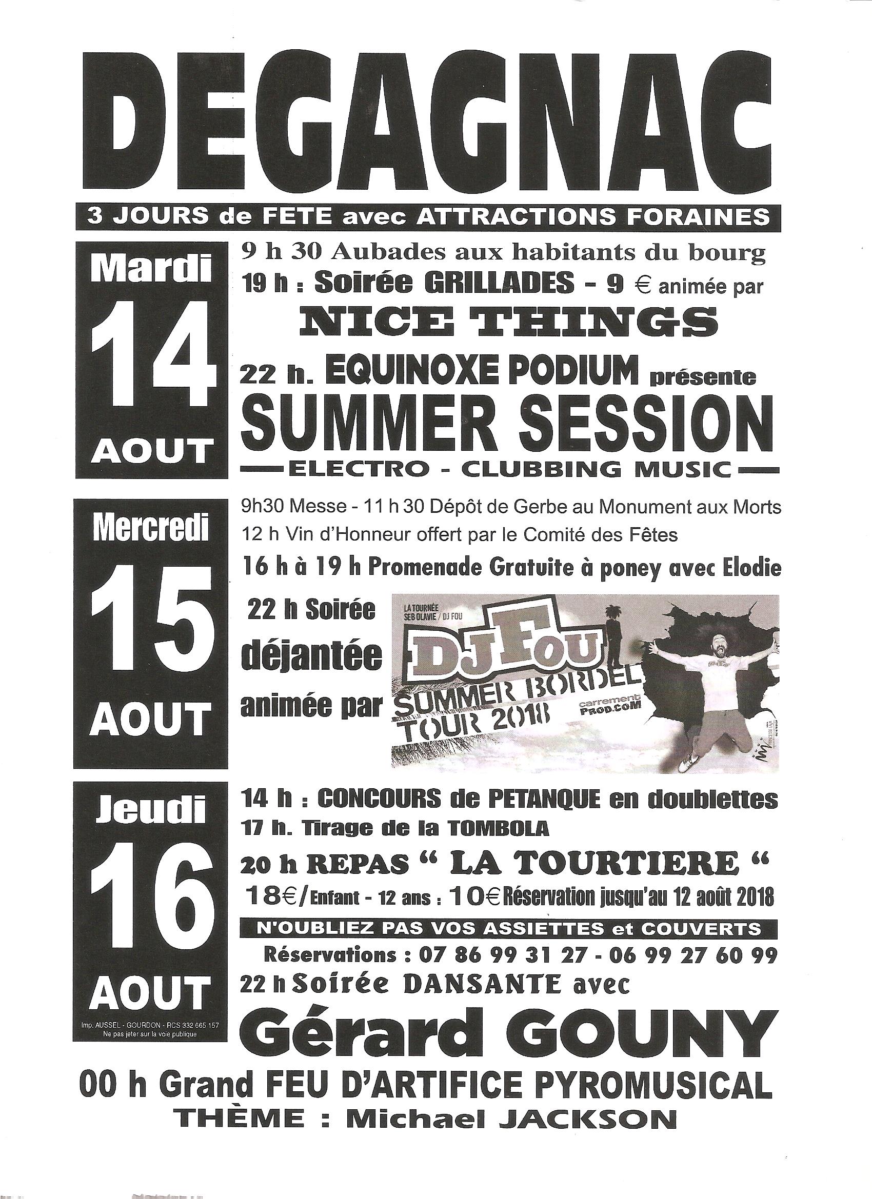 Les 14, 15 et 16 août se déroulera la traditionnelle fête votive à Dégagnac. Les artistes de Nice Things, Equinoxe, DJ Fou, et Gérard Gouny enflammeront le village . Un spectacle pyromusical éclatera dans le ciel de Dégagnac le 16 à minuit.