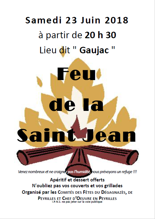 - 22H30: Feu de la Saint-Jean (Parking du Pont de la Gare)