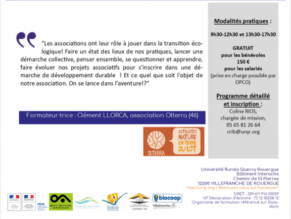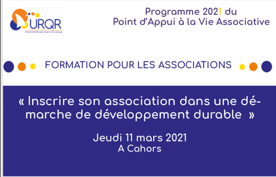 Formation au Développement Durable Publié le lundi, 1 février 2021lundi, 1 février 2021 par jevouslis Le jeudi 11 mars 2021 Lieu : CahorsTarif : Gratuite pour les bénévoles – 150 € pour les salariés (l’URQR est référencée Datadock et peut recevoir les fonds de la formation professionnelle)InformationsColine RIOS,chargée de mission,05 65 81 26 64 crib@urqr.org
