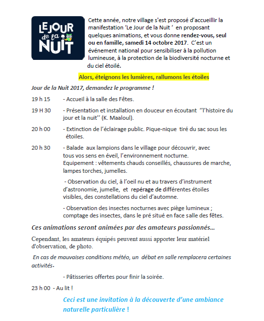 Le Jour de la Nuit 14 octobre consiste à éteindre une partie des éclairages publics afin de sensibiliser à la pollution lumineuse et permettre aux habitants de mieux voir les étoiles le temps d’une soirée. Au programme : balades nocturnes ; observations des étoiles ; sorties nature et extinctions des lumières.