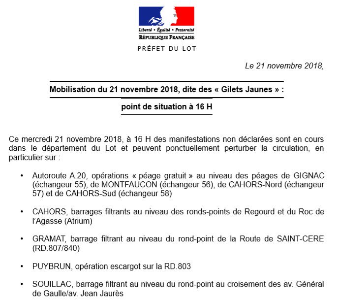 La préfecture du Lot communique : « Ce dimanche 18 novembre, à 10 h, des manifestations non déclarées sont en cours dans le département du Lot et risquent d’entraîner des difficultés de circulation, en particulier sur :