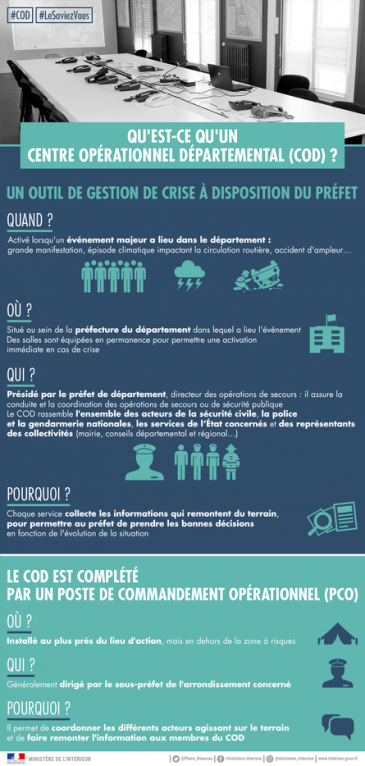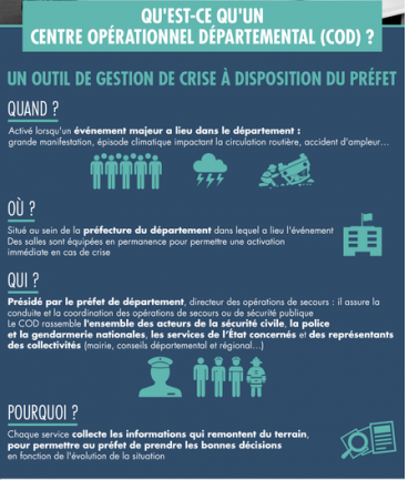 Le COD est un outil de gestion de crise à disposition du préfet qui ‘active quand un événement majeur a lieu dans son département (importantes manifestations, épisode climatique impactant la sécurité routière, accident de grande ampleur…). Présidé par le préfet, il rassemble l’ensemble des acteurs de la sécurité civile, la police et la gendarmerie nationales, les services de l’Etat concernés et les représentants des collectivités.