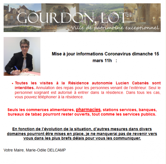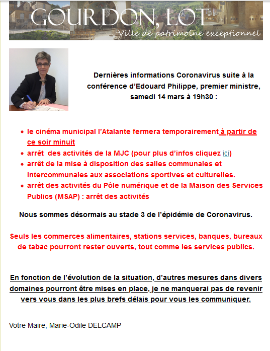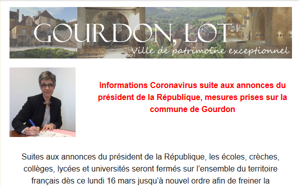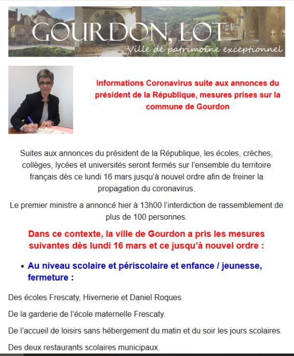 Dernières Informations Coronavirus Résultats des élections à Gourdon Publié le dimanche, 15 mars 2020dimanche, 15 mars 2020 par jevouslis R Résultat des élections à Gourdon cliquez sur l’image pour avoir la suite Dernières informations des préfets Fermeture des écoles, : les réponses à vos questions