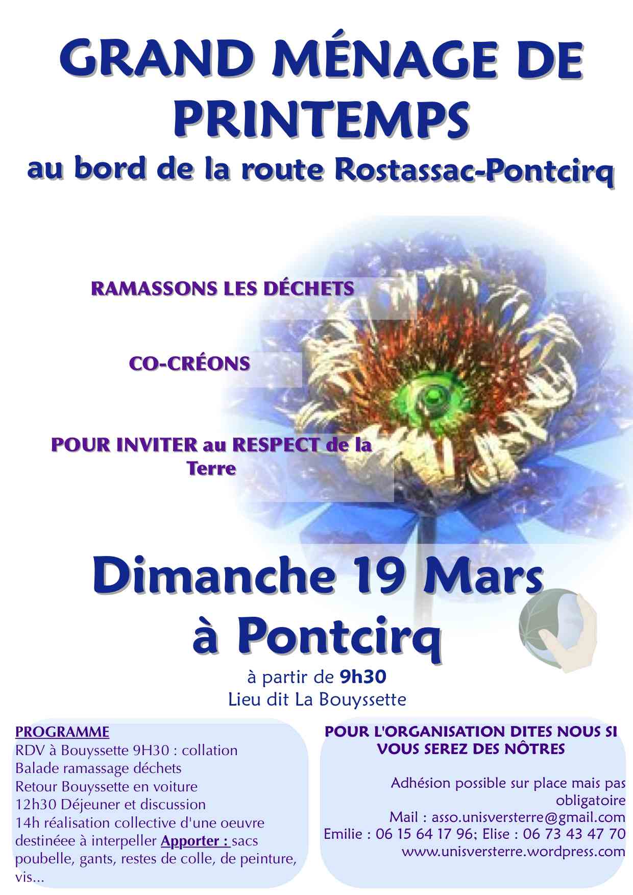 Venez nous rejoindre pour une marche joyeuse le long de la départementale entre Rostassac et Pontcirq le Dimanche 19 Mars (RDV 9h30 Lieu Dit Bouyssette)