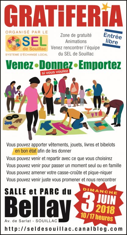 Le Sel de Souillac organise sa traditionnelle Gratiféria annuelle le 03 juin à la salle du Bellay de 10h à 17h. Possibilité de restauration sur place avec repas partagé tiré du panier.