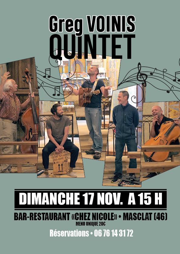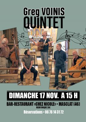 Greg Voinis Quintet se produit Dimanche 17 Novembre à 15h au Bar-Restaurant « Chez Nicole », dans le Bourg de Masclat.