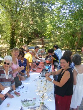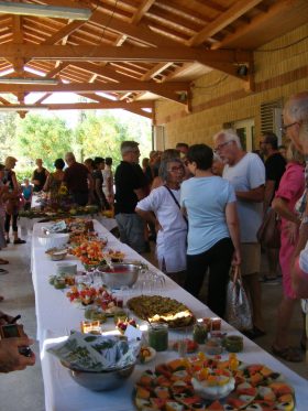 Bien-sûr le moment le plus attendu était le repas ! Les cuisinier(e)s bénévoles de l’association s’étaient surpassé(e)s pour confectionner un buffet d’entrées apéritives qui régalaient les yeux autant que les papilles ! Ce fut ensuite 160 convives qui ont pris place dans la salle des fêtes : tian de légumes et saucisses grillées, fromage, grand choix de desserts, café…. Le tout servi par les bénévoles toujours calmes et souriant(e)s.