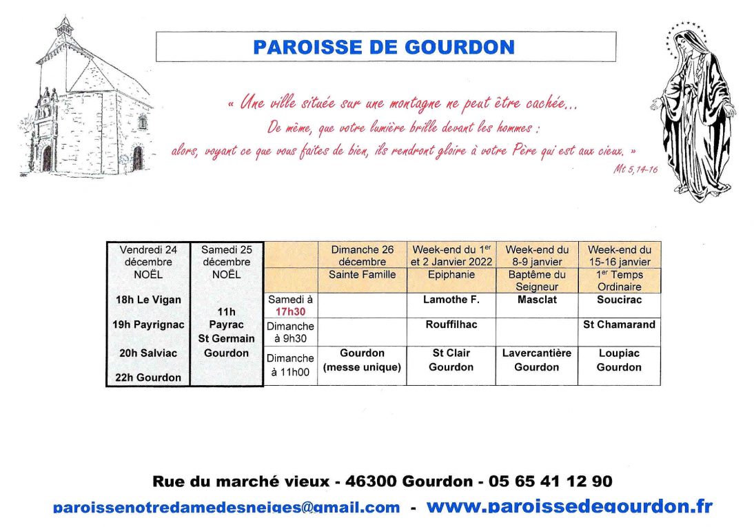 Cette année la paroisse vous offre un grand choix d’horaires afin d’assister à une des messes de Noël, que ce soit pour la veillée, ou le jour de la Nativité, en différents lieux proches de chez vous.
