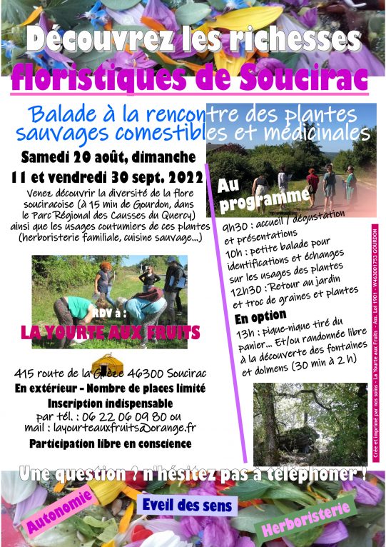 Venez découvrir l’incroyable biodiversité de la flore Souciracoise… A 15 minutes de Gourdon, dans le Parc régional des Causses du Quercy. Cette balade floristique se déroule en toute convivialité après une petite dégustation et une présentation de l’herboristerie et de la cueillette, nous échangeons sur les vertus et dangers des nombreuses plantes comestibles et médicinales qui jalonnent notre parcours.