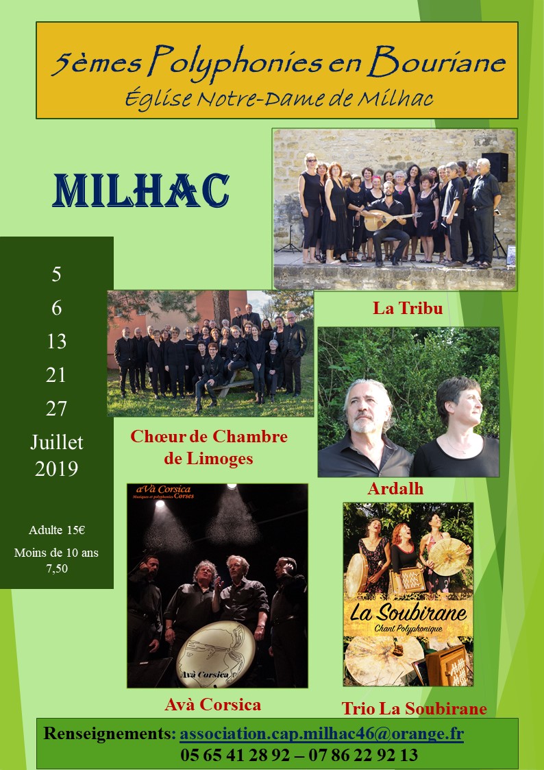 Vendredi 5 juillet à 21H, l’Ouverture des 5ème Polyphonies en Bouriane se déroulera sur le Parvis de l’Église Notre-Dame de Milhac où La Tribu, chants Polyphoniques du Vigan nous entrainera loin par la puissance de leurs chants, de leurs voix et des percussions qui les accompagnent !