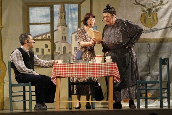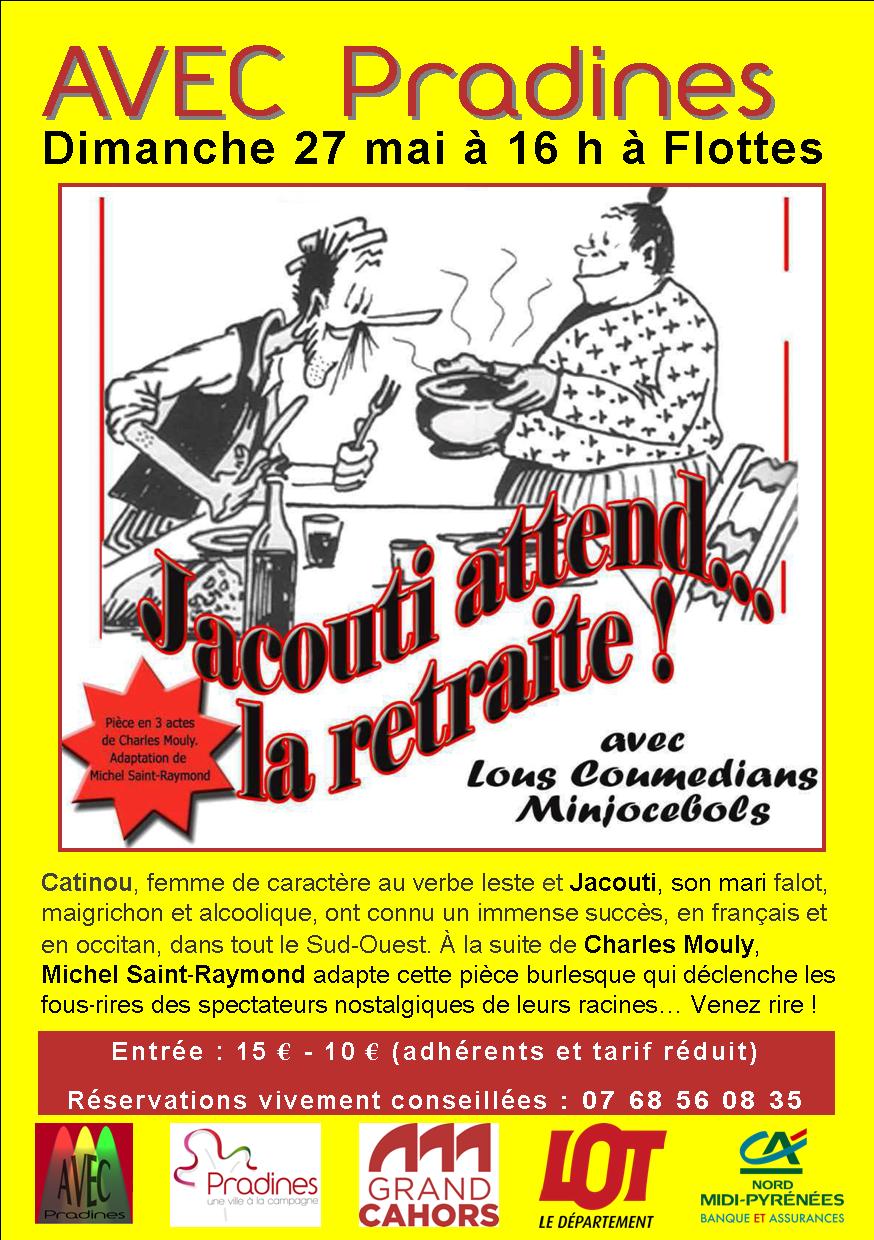 Michel Saint-Raymond, campe le personnage de Catinou, et les comédiens font revivre sur scène avec une véritable authenticité, le petit peuple de ce village typique d’une époque révolue que l’on a grand plaisir à retrouver. Jacouti, face aux poids des factures impayées et des maigres revenus de ces derniers mois, décide de solliciter la retraite… Mais les démarches sont un long chemin parmi le labyrinthe administratif complexe, malgré toute l’aide et le dévouement des amis, Marie-Cancan la secrétaire de mairie et Phrasie l’agent d’assurances.