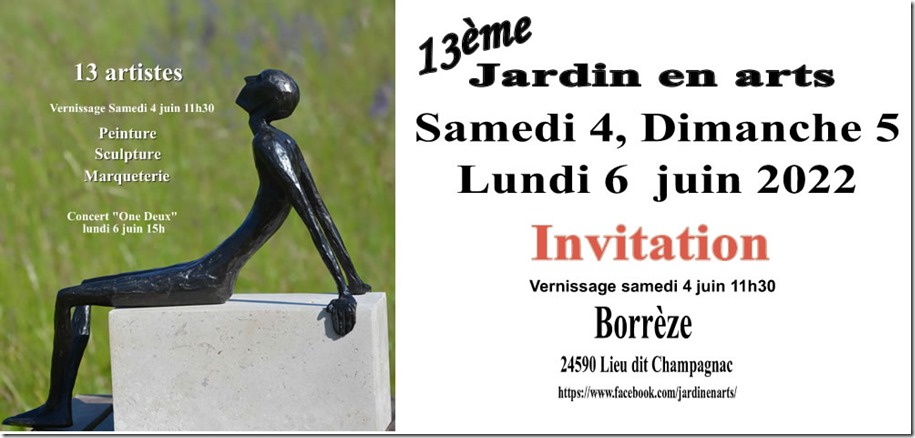 Après deux années d’interruption, l’équipe de Jardin en Arts est heureuse de vous accueillir à nouveau dans le cadre bucolique de Champagnac, à Borrèze, pour la 13 ème édition de l’exposition. Quatorze artistes vous y attendent au fil de ces trois journées.