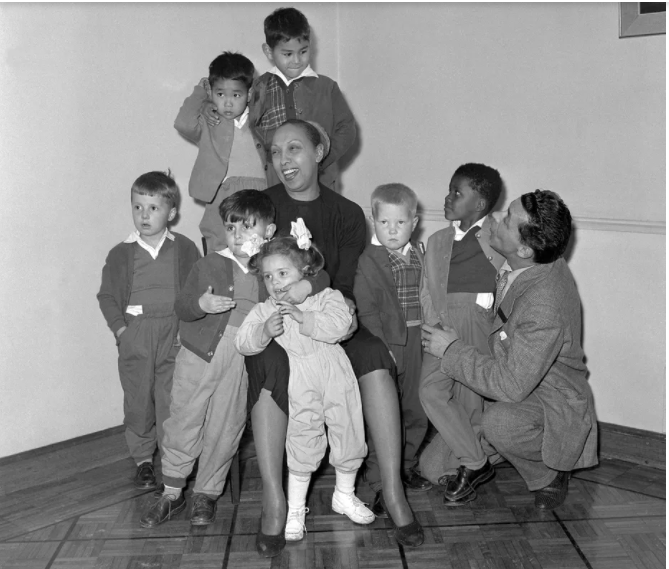 En 1950, toute sa famille l’a rejointe. Son frère tient la nouvelle station à essence à l’entrée du village, sa sœur ouvre une pâtisserie. Même sa mère, Carrie, a quitté Saint-Louis pour venir vivre auprès d’elle. Ne manquent plus, pour parachever son œuvre humaniste, que des enfants. Joséphine a 44 ans et a subi une hystérectomie à la suite d’une grave infection pendant la guerre. Les Bouillon-Baker ont donc décidé d’abriter aux Milandes une « tribu arc-en-ciel » composée de marmots de nationalités et de religions différentes. Echaudée par le racisme et le mépris de classe, l’icône afro-américaine a déjà dit à son ami Fidel Castro combien elle admirait l’harmonie raciale cubaine, et son projet parental hautement symbolique a pour elle valeur de manifeste. Un demi-siècle avant la saga médiatique d’Angelina Jolie et Brad Pitt, le couple va donc adopter, au gré de ses tournées, dix garçons et deux filles sur tous les continents. Américaine, Noire, riche, excentrique, la détonante Joséphine Baker va marquer les esprits en Dordogne avec sa tribu hétéroclite. Car les douze enfants Bouillon, dont les plus jeunes sont scolarisés à Castelnaud-la-Chapelle, grandissent avec les marmots du village. Joséphine, qui se veut « mère universelle » d’une famille à la fois multiraciale et enracinée, ouvre grand son parc à tous les gamins du monde, invite même une cinquantaine de petits voisins chaque année pour le repas de Noël.