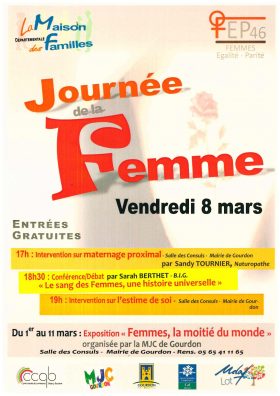 L’association Femmes Egalité et Parité de Souillac, et la Maison Départementale des Familles de l’Udaf organisent en partenariat avec la MJC, la bibliothèque intercommunale et la mairie de Gourdon des animations lors de la JOURNÉE DE LA FEMME