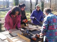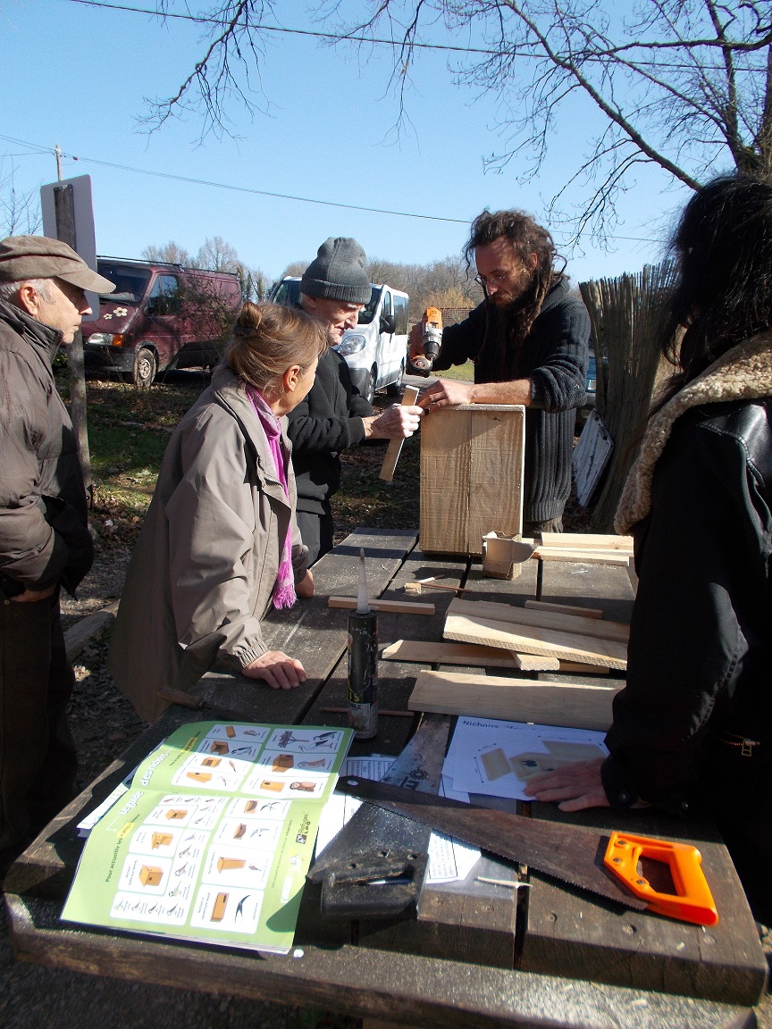 La journée a commencé par le nettoyage des nombreux nichoirs existants et dispersés dans le Jardin. Cela a permis de constater qu’ils ont tous été occupés l’an dernier. Puis scies, perceuses et marteaux se sont mis en action pour la construction de nouveaux nichoirs.