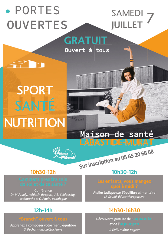 Samedi 7 juillet, une journée « portes ouvertes » autour du sport-santé-nutrition aura lieu à la Maison de santé du causse de Labastide-Murat. Axée depuis son ouverture sur l’accompagnement et la prévention, la Maison de santé souhaite attirer toute personne au-delà du simple volet curatif, en élargissant son programme autour du bien-être et de la nutrition. Toute la journée est gratuite et ouverte à tous.