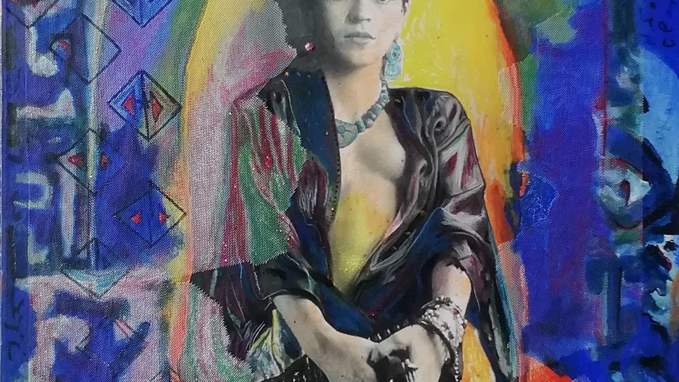 Ses tableaux aux couleurs flamboyantes, dominés par le bleu de « la casa azul » maison de Frida Kahlo, réhaussés par des découpages et autres objets, donnent une touche très personnelle et originale.