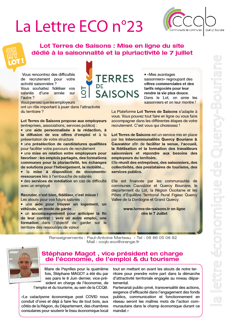 Pour tout renseignement, contacter Paul-Antoine MARTEAU, Responsable du Pôle Développement Local et Numérique – Tél : 06 86 05 06 82 – Mail : ccqb.eco@gmail.com