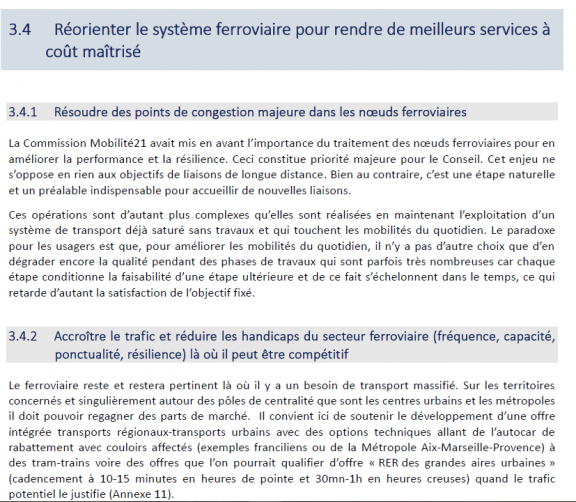 Le rapport se donne plusieurs lignes directrices : la modernisation des « transports du quotidien » très dégradés, tout en réduisant les émissions de gaz à effet de serre (une obligation de la loi de transition énergétique), le tout avec un budget contraint. Partant de là, il propose trois scénarios correspondant à trois niveaux de dépense, du plus bas au plus élevé, et qui conditionnent directement l’avenir des grands projets d’infrastructures :