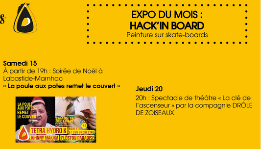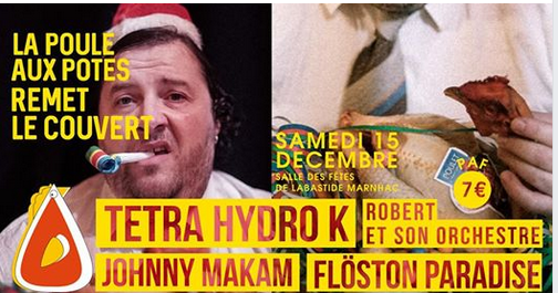 Après une première édition (Noël dernier) ayant accueilli près de 300 personnes, La poule aux potes se délocalise à nouveau le samedi 15 décembre de 19 h 30 à 2 heures du matin, au sein de la salle des fêtes de Labastide-Marnhac, pour proposer une soirée musicale avec quatre groupes aussi talentueux que déjantés au programme : Tetra Hydro K et son laboratoire fada dont le son oscille entre dub, steppa, jungle, drum’n’bass et jazz ; Floston Paradise, groupe mi-punk, mi-princesse ; Johnny Makam qui nous amènera danser non loin des Balkans ; Robert été son orchestre assureront les interplateaux au rythme des chansons de comptoir de Dudule et de sa contrebasse qui répond au doux nom de Robert. Entrée : 7 euros. Restauration et buvette sur place, deux boissons offertes pour les Sam. Programme sur Facebook (lapouleauxpotes).