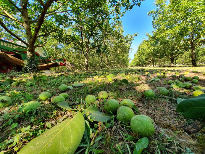 Avec 8 à 15 jours de retard sur la saison, la récolte des premières noix a commencé sur le nord du Lot. « C’est d’abord la noix fraîche que l’on ramasse. Celle dont le cerneau se consomme tel quel, avec un bon vin ou du fromage, et peut se conserver au réfrigérateur quelques jours, comme l’amande fraîche », lance Laurent Perrier, en observant le travail du secoueur en pleine action dans sa culture de noyers de Saint-Michel-de-Bannières.