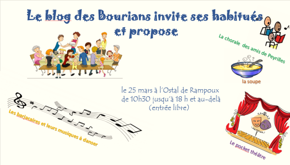 la chorale « Les Amis » nous accueillera , on rira avec « Feu la mère de Madame » de Feydeau par le Pocket théâtre, on dansera avec les Barjacaïres, on parlera du Blog des Bourians qui nous réunit tous et nous donnerons les résultats du Quiz.