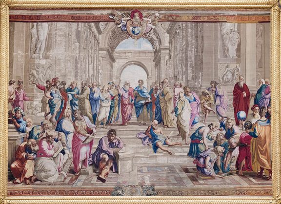 Le 15 septembre 2020, la tapisserie de l’École d’Athènes a retrouvé sa place historique dans l’hémicycle, après trois ans de restauration au sein des ateliers du Mobilier national qui en est propriétaire.