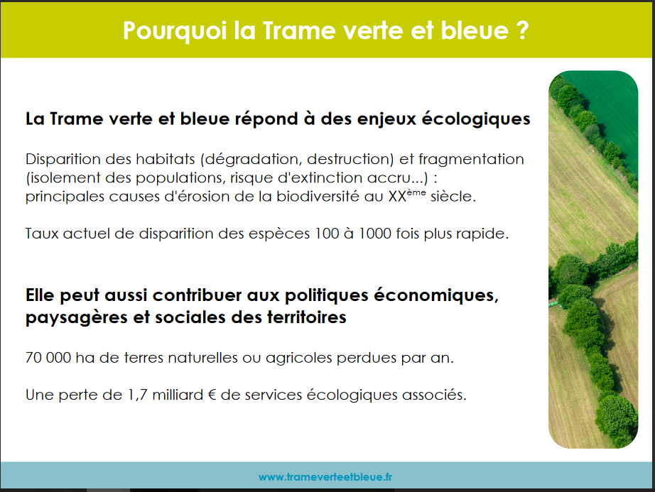 Quelques Grenelle de l’environnement plus tard, la Trame Bleue (cours d’eau, mares, étangs, tourbières, zones humides…) et la Trame Verte (forêts, prairies, haies, bosquets, ripisylves…) doivent désormais être identifiées et intégrées dans des projets de PLU (ou dans les PLU existants) suivant le schéma régional de cohérence écologique (SRCE) validé en mars 2015 pour la région Midi-Pyrénées avec application obligatoire dans les trois ans suivants.