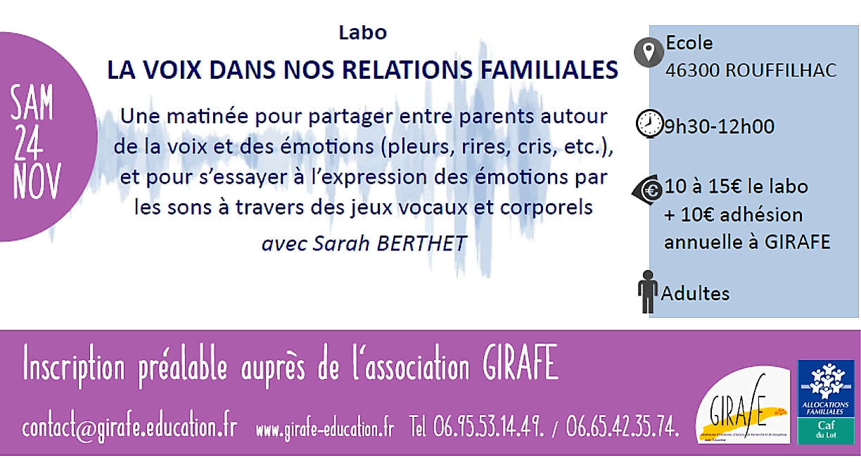 Samedi 24 novembre, de 9h à 12h à la salle des fêtes de Rouffilhac, l’association GIRAFE vous propose l’atelier « la Voix dans nos relations familiales » animé par Sarah Berthet.