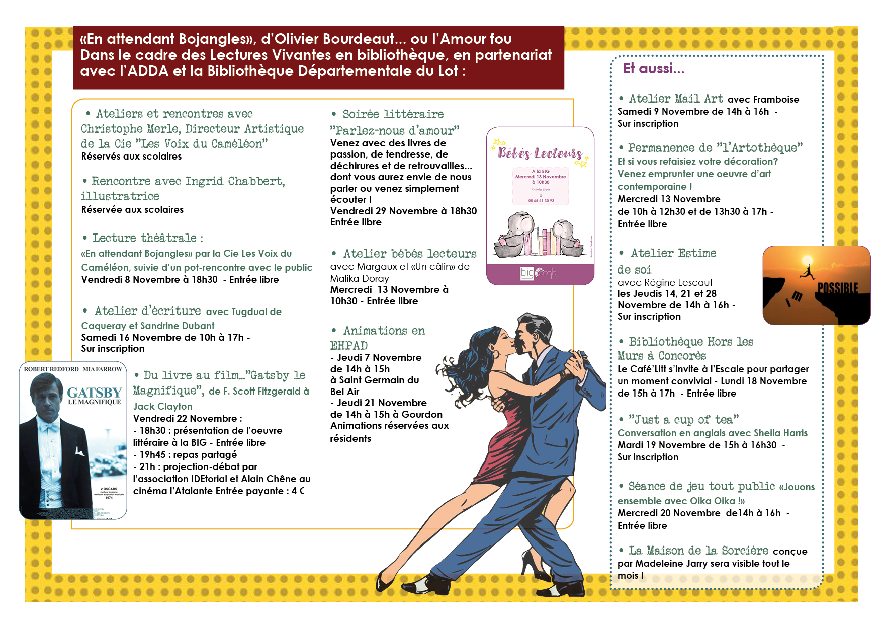 vendredi 8 novembre, un instant suspendu de beauté et de partage lors de la représentation de « En attendant Bojangles », lecture musicale d’une oeuvre très originale, au départ livre (roman français d’Olivier Bourdeaut paru le 7 janvier 2016 aux éditions Finitude), puis BD (Ingrid Chabbert, Carole Maurel, éd. STEINKIS EDITIONS, 01/11/2017) et maintenant qui continue son chemin comme perle théâtrale grâce à l’ADDA du Lot et la compagnie lotoise « les voix du caméléon ». merci à la Big!!