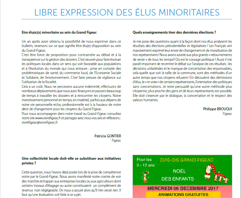 «Nous avons obtenu l’expression des élus minoritaires dans le journal communautaire du Grand Figeac et sur le site. Concernant le centre de santé, les premières fois que nous avons évoqué cette possibilité qui induit le salariat des médecins on nous a dit que c’était impossible. Maintenant, le Grand Figeac met en avant le caractère unique de cette structure en Occitanie. On a demandé la prise en compte de l’agriculture par le Grand Figeac, même si l’axe choisi la vigne n’est pas pour nous une priorité», citaient-ils.