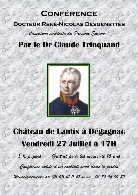 Dans le cycle des conférences estivales au Château de Lantis le Docteur Claude Trinquand nous parlera de l’aventure médicale au premier Empire et notamment du Docteur René -Nicolas Desgenettes médecin en chef de la garde impériale .