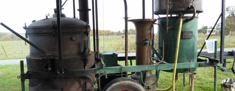 Alors, si vous passez par Montamel, n’hésitez pas à aller à sa rencontre; il vous expliquera l’agencement des ustensiles, la chauffe à l’ancienne au bois bien sec, le corps de chauffe en cuivre, le col-de-cygne, la colonne de rectification et le refroidisseur, les échanges entre l’alcool faible et l’alcool fort mesurés par l’alcoomètre qui permettront après diverses manipulations avec de l’eau froide t’atteindre le degré autorisé : 50°.