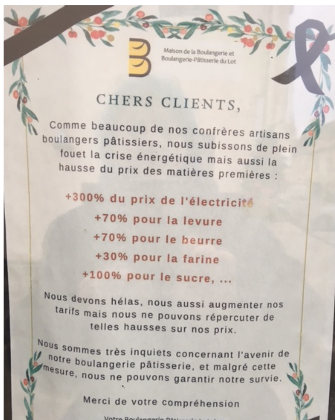 Dans la boulangerie de St Germain du Bel AIr, la boulangère est désarmée. Elle ne sait pas ce qui va arriver. A combien s’élèvera la prochaine facture de gaz,; celle qui permet de cuire le pain, celle qui a déjà augmenté le mois dernier. Reporter le paiement des cotisations sociales ?Etaler le paiement des factures ? » ce n’est pas ça qui résoudra le problème car il faudra bien quand même les payer. »