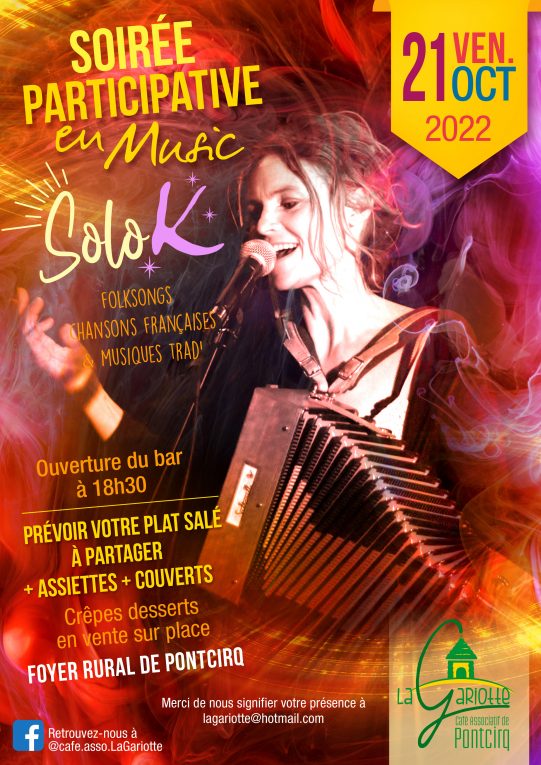 Nous vous convions le Vendredi 21 octobre 2022 à partir de 18h30 au foyer rural de Pontcirq, heure de l’ouverture du café associatif, pour une soirée sous le signe du partage avec en prime une animation musicale qui en ravira plus d’un-es, puisque nous accueillerons Estelle Kessler sous son nom de scène Solo K, qui vous propose une exploration musicale sillonant la chanson française, la folksong et la musique trad’ avec ses compagnons de scènes, son accordéon, sa petite guitare, et sa magnifique voix …