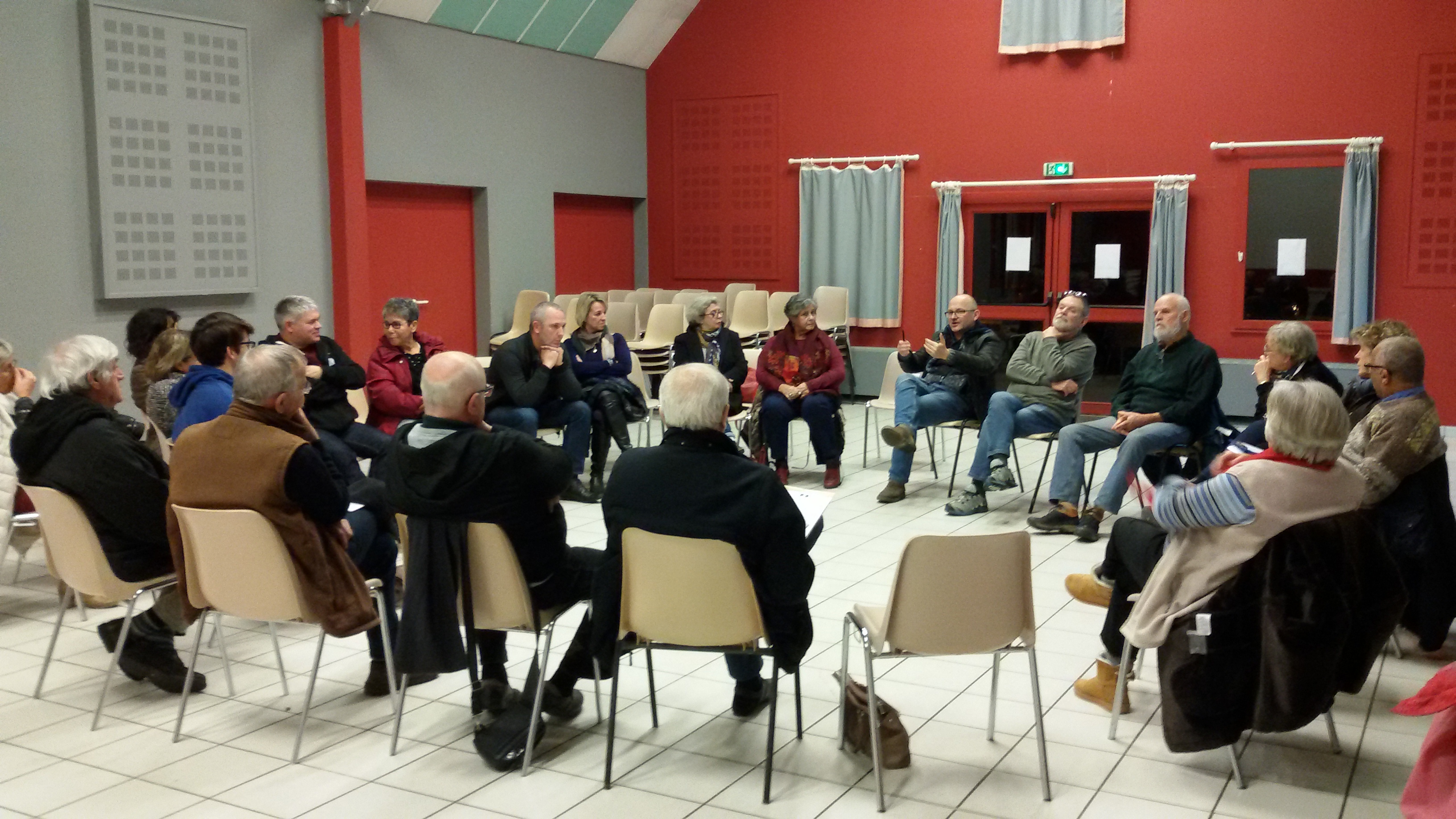 Un débat très intéressant, 28 personnes, c’est le premier débat du territoire. On choisit 2 thèmes d’une heure chacun: fiscalité et écologie. Quelques exemples de sujets abordés:Tout le monde devrait payer l’impôt sur le revenu cela renforcerait le sentiment qu’on est un citoyen, il faudrait lier cette mesure au revenu universel. Le problème de l’ISF est abordé, celui des écarts de revenu… En ce qui concerne l’écologie on a le sentiment que les pays voisins en particulier l’Allemagne se débrouillent mieux… Problème des transports aériens, des camions…