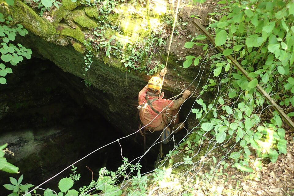 Crédit photo : L’équipe du Groupe Spéléologique du Quercu va descendre dans l’igue de Cavaniès à Cahors, à plus de 20 mètres de profondeur, pour enlever des pneus jetés illégalement. (©GSQ)