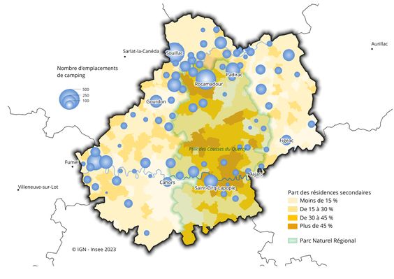 En 2019, on compte 22 200 résidences secondaires, représentent 18,5 % du parc de logements . C’est quatre points de plus que dans le département voisin de la Dordogne, également touristique.
