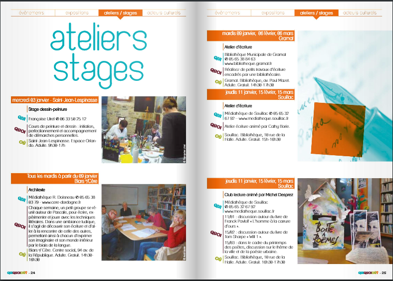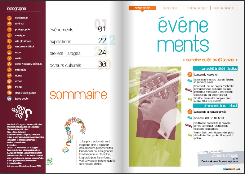 Quiquoioù est l’agenda culture et patrimoine de Cauvaldor. Il recense l’ensemble des propositions artistiques, culturelles et patrimoniales sur les 79 communes de Cauvaldor. Il parait tous les trimestres sous version numérique ou papier.
